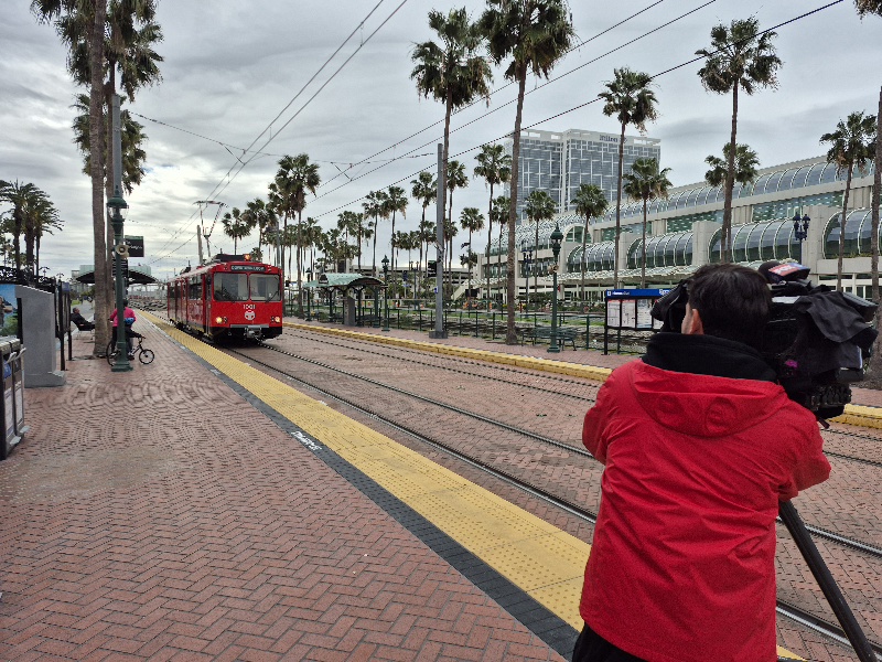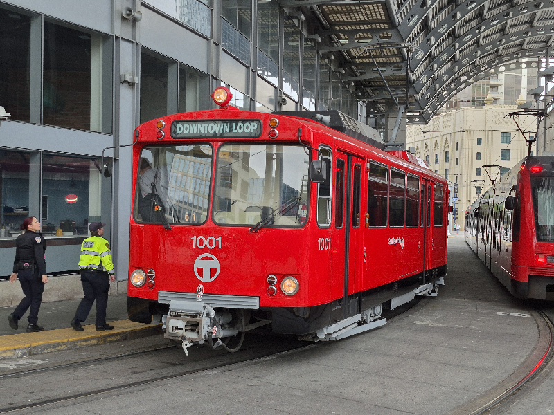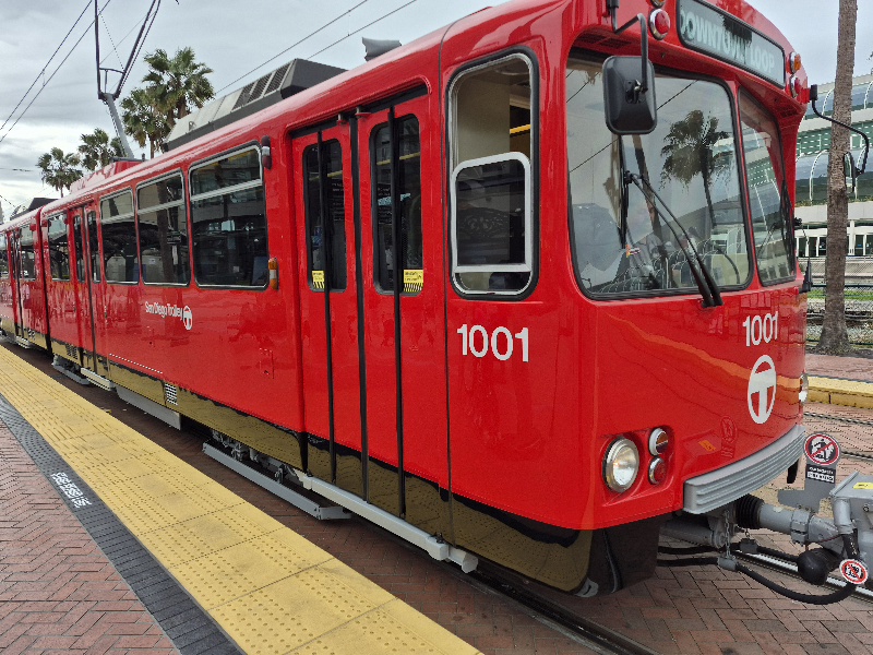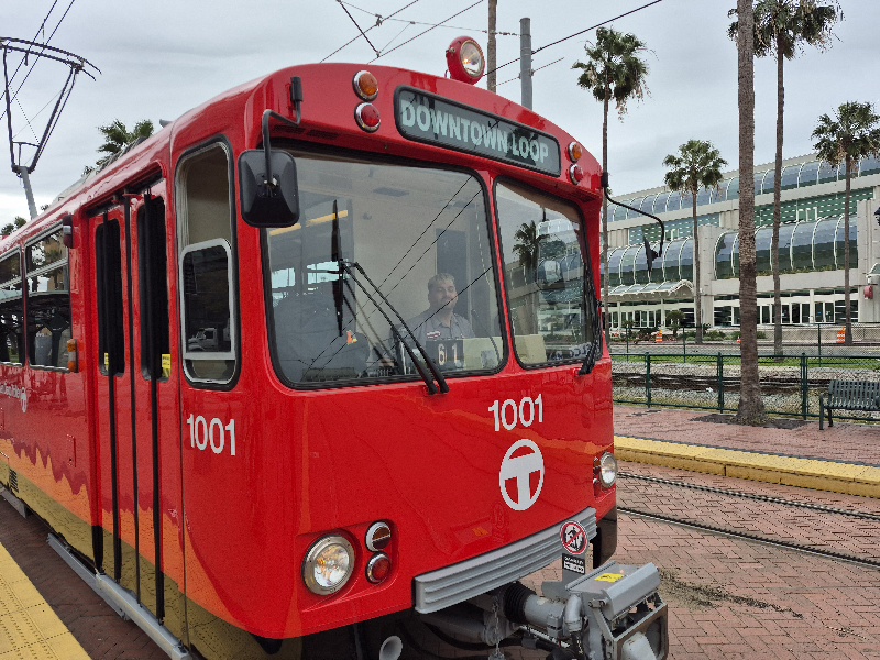 Good old San Diego Trolley car number 1001 is running in downtown today. It operates along the Silver Line loop during holidays–and today is Presidents’ Day!