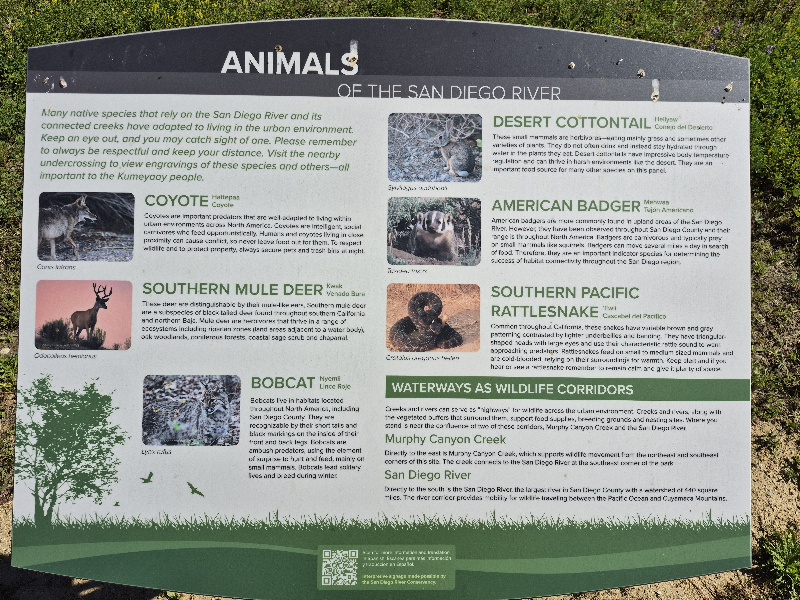 At the east end of the SDSU Mission Valley river park, near Murphy Canyon Creek, beside Interstate 15, a sign shows some of the Animals of the San Diego River.