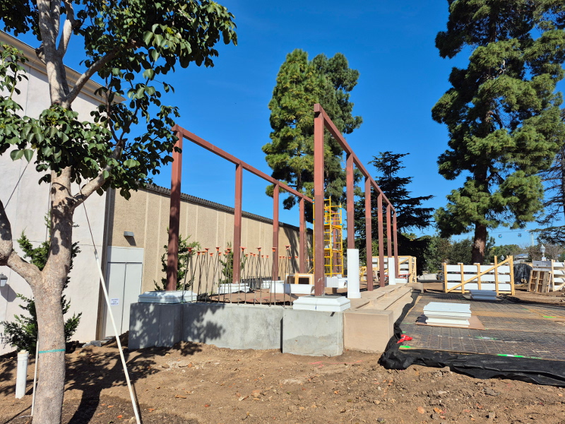 Trees have been planted behind the structure. Steps are being installed in front of it. Columns are appearing. Looks like other features are on the way, too!