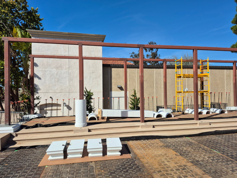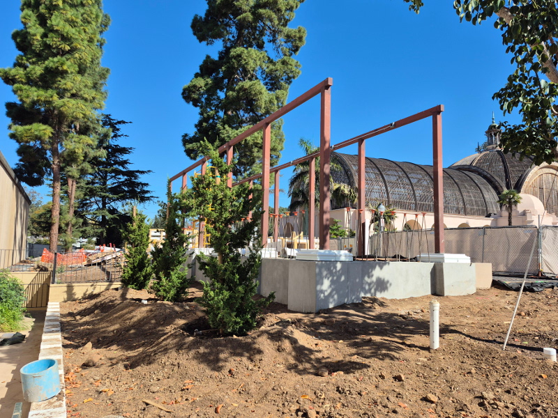 This pergola recreates one built for the 1915 Panama-California Exposition–but since long gone. The structure is rising near the west end of the Botanical Building, at the perimeter of the new Central Gardens, which are also now being developed.