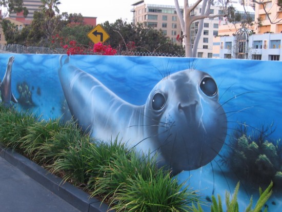 Okay, what you see is actually a very cool mural. And the shark is just a small portion of it. This awesome mural on a long wall by the gas station contains a bunch of surprising, colorful images! Check out the blue gravel path at the foot of the wall, enhancing the underwater effect!