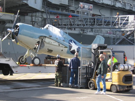 4 thoughts on “Restored Wildcat fighter lifted onto USS Midway.”