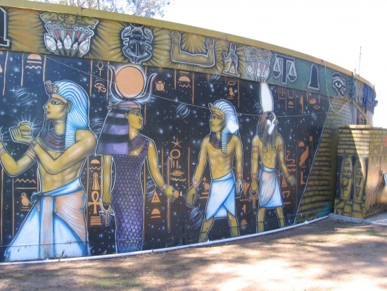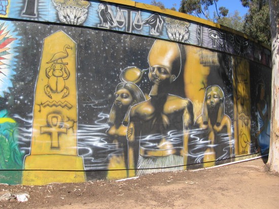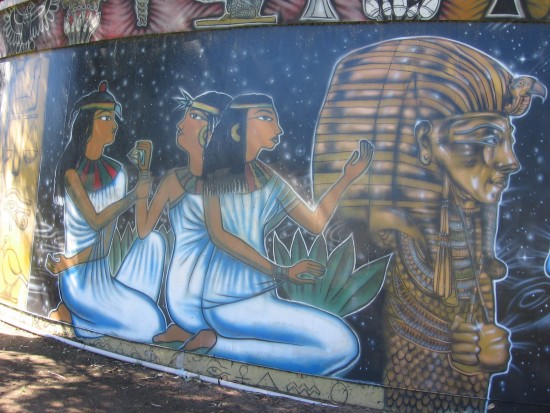 Egyptian figures painted on the north side of the WorldBeat Cultural Center.
