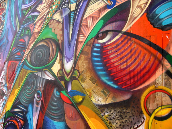 Wow! Check out this mind-blowing street mural, which caught my eye just across Dewey Street from Chicano Park. Titled Ancestors, it was spray-painted on a Barrio Logan building in 2013 by artists Maxx Moses and Isaias Crow.
