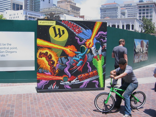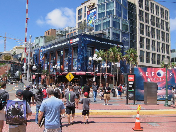 Visitors to Horton Plaza are invited to become colorful superheroes during San Diego Comic-Con.Just inside door of Spreckels Theater Building where Conan O’Brien audience picks up tickets.Snoopy with granny glasses peers from Gaslamp shop window.Poster in Gaslamp advertises William Shatner’s Man O’ War.Entertainment Weekly had lots of people posing for photographs. Superheroes of San Diego!It does indeed look like Fear Begins Here.Video board promotes exciting NBC television programming in Gaslamp Square.Heroes Reborn venue had huge images of the powerful characters around the black structure.Their biggest mistake was betting against him. The Player. Thursdays this Fall on NBC.Photo of crowd crossing Harbor Drive and trolley tracks between San Diego Convention Center and Gaslamp Square.LEGO Bane is on the wall of the Hard Rock Hotel!The cosmic wrap and astronaut figure on the Hard Rock Hotel building advertises The Expanse, coming soon on Syfy.Ladies in Sharknado 3 shark heads hold signs indicating It’s Your Patriotic Duty to Embrace the ‘Nado!The downright silly new Colonel Sanders is shown as a unicorn standing by Martin Luther King Jr. Promenade.Awesome cosplay in downtown San Diego for 2015 Comic-Con. Three against one! I don’t have a chance!A large troop of Colony soldiers marches down Martin Luther King Jr. Promenade during Comic-Con.Schick offered free shaves near the Assassin’s Creed obstacle course. Schick has partnered with software developer Ubisoft.You, get in here! It seems everyone is trying to attract the attention of thousands of Comic-Con attendees.Webtoon. Long live comics!People dine at the Tin Fish, which is completely wrapped in NBC Blindspot graphics. A mind erased. A body of clues.It’s LEGO Homer Simpson! He’s equipped with some tough-looking Transformer-like armor, which includes Wonder Woman and Gollum on top!These suited bald guys with barcode tattoos on their necks are lined up to promote Hitman: Agent 47.It looks like Hulk shrank a bit!Obi-Wan Kenobi seemed to have the situation in hand. That’s a pretty big crowd passing by, however, and I’ve seen a number of nasty-looking villains!You scream, I scream, the Scream Queens serve ice cream!This huge super cool robot is called MegaBot. It arrived near Petco Park for Comic-Con on Wednesday.Dark Souls III has a cool backdrop at the Comic-Con Interactive Zone next to Petco Park. Can these guys remove the sword from the stone wall?Scouts Guide to the Zombie Apocalypse is an upcoming movie, and a fun venue in the Interactive Zone.Darth Vader challenged me to a light saber duel. I declined. I like my limbs.Inflatable slides at the Comic-Con Interactive Zone were set up to promote The Peanuts Movie.Is that Snow White smiling at me? Don’t bite that apple!That is either a Spartan, a Trojan, or a guy who likes USC football.Batman has seen enough of this rabble. He’s looking grim and determined to do something.Stoop Kid’s afraid to leave his stoop. Or perhaps remove a Star Trek uniform.As the evening progresses and the FX Fearless Arena Experience closes for the day, Sex, Drugs and Rock and Roll are abandoned.Archer graphic in the Hilton Bayfront Park.American Horror Story Hotel has closed for the day and a video photographer exits. Was it too scary for him?Model grabs at swirling dollar bills in window of American Horror Story Hotel while being filmed.Kid checks out vacant entrance to the Bastard Executioner venue. Escape the forest duel!I’m guessing this passage near the exit is where thrill-seekers escape the forest duel.Upside down Louie seems to wait in line for Hall H with thousands of Comic-Con fans. They’ll be sleeping outside all night on the grass or concrete. That’s dedication!Hunkering down for a long wait behind the San Diego Convention Center. These guys are near the Adult Swim carnival.Now that’s a lot of people waiting to see panels in Hall H tomorrow. And there are many more behind me!Folks riding a unicorn prepare to launch above the Omni Hotel into the cloudy blue sky, over a gigantic bubble resting on the grass!That bubble is actually a huge, working snow globe promoting Fargo. The Waffle Hut is inside!Oh, dear. More zombies on the loose.Time to head back across Harbor Drive as the day ends. Even a pair of Leias have to eat dinner.Looking down from Harbor Drive bridge at San Diego rail yard and a bus with Game of Thrones wrap turning about.Everybody had a great time. Day 1 of San Diego Comic-Con is coming to a close.A couple slowly walks along after a busy day. That’s one gigantic swag bag!