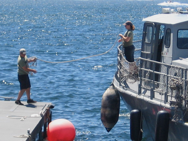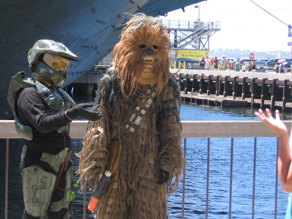 Gull takes flight near fishing pier at Embarcadero Marina Park South.Folks relax as they listen to a small concert by a Seaport Village fountain.These talented kids playing classic rock tunes in Seaport Village form the band Gen-X!Chewbacca is hanging out with a Star Wars buddy near the USS Midway Museum.Looks like Tom Cruise has shore leave after landing his Top Gun fighter jet on that big aircraft carrier docked there behind him!Two enjoy the sparkling water beside the Cruise Ship Terminal.Students prepare to board the Star of India. A cool Moby Dick Marathon Reading is coming next weekend to San Diego’s historic tall ship.Throwing a rope as Maritime Museum of San Diego’s restored Swift Boat returns from a harbor cruise.