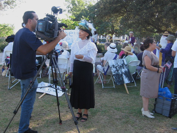 Two women head for Sefton Plaza in Balboa Park, where a suffrage rally would celebrate the anniversary of the 19th Amendment.The 19th Amendment to the United States Constitution was ratified on August 18, 1920. It guarantees all American women the right to vote.Historical sign proclaims a woman living here has registered to vote thereby assuming the responsibility of citizenship.In period attire, the person being interviewed played the role of San Diego philanthropist and trailblazer Ellen Browning Scripps during the rally.The woman with the microphone portrayed American suffragist and social activist Elizabeth Cady Stanton, who wrote many of Susan B. Anthony’s speeches.Many wore historical sashes, hats and costumes to commemorate suffragettes and leaders who have fought for equal women’s rights.One participant reenacted Eleanor Roosevelt, speaking about her life and accomplishments. The statue is of Kate Sessions, one of the founders of Balboa Park.The suffrage parade begins. Participants march toward the heart of Balboa Park, down El Prado and over the Cabrillo Bridge.