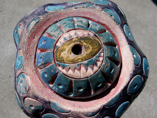 Ceramic eye atop parking lot post at north end of Balboa Park’s art-filled Spanish Village. Various faces and fun eyeballs decorate nearby posts.