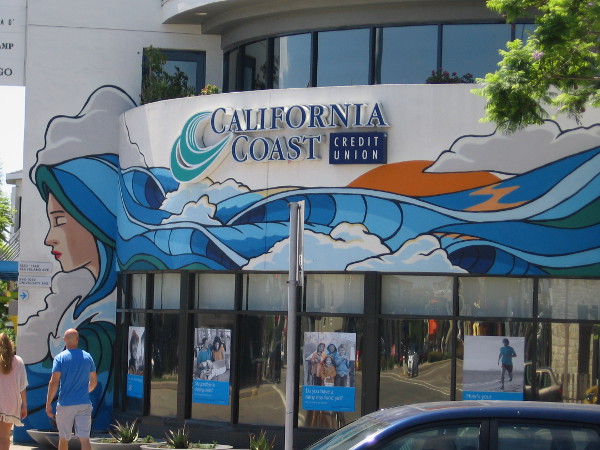Long blue hair becomes ocean surf. Artwork painted on California Coast Credit Union.