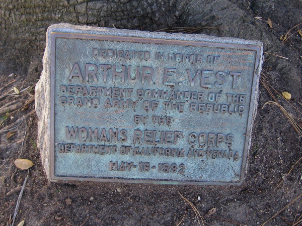 Old plaque at base of large tree in the middle of the surrounding cottages. Dedicated in honor of Arthur E. Vest, Department Commander of the Grand Army of the Republic.