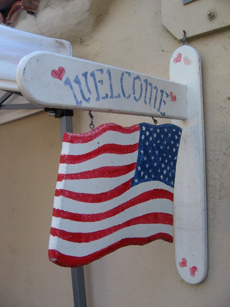 American flag and a Welcome at the front door of the USA cottage in Balboa Park.