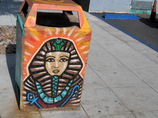 One of several trashcans on Park Boulevard and University Avenue painted with colorful Egyptian motifs.