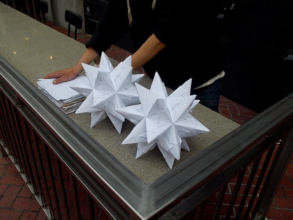 A guy hanging out in front of the Hard Rock Hotel in the Gaslamp made these three dimensional origami stars using scraps of paper. Each one takes about two hours to make.