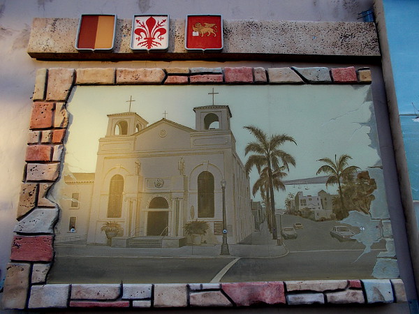 Mural titled I Pescatori by artist Renee Garcia, 2003. Depicts tuna fishermen who lived in Little Italy (many were Italian immigrants) fishing off the coast of San Diego.