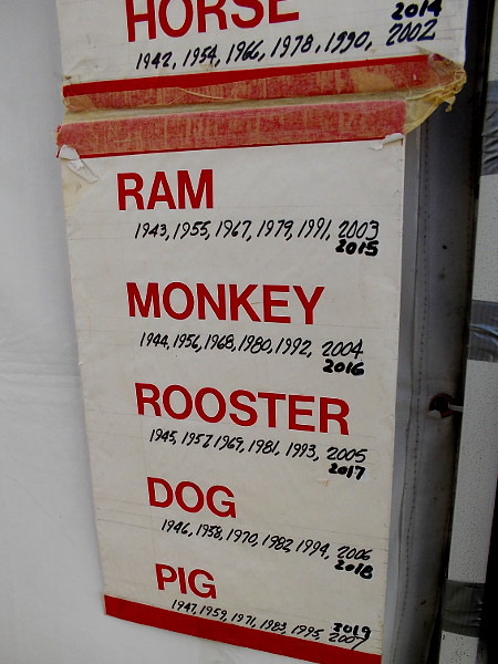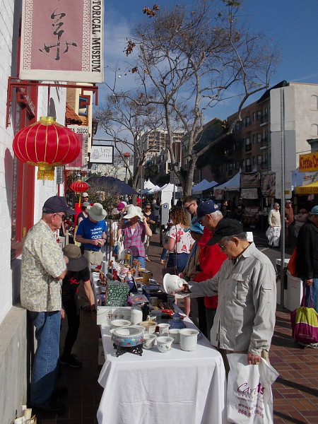The CCBA Lucky Lion Dancers would soon be heading down the street through the crowd.Tables in front of the San Diego Chinese Historical Museum contain arts, crafts and many unique cultural objects.These funny faces were for sale in a vendor’s booth. There was a lot of Asian food and a variety of colorful wares for visitors to purchase.Uniquely beautiful art could be seen up and down the street during the San Diego Chinese New Year Food and Cultural Fair.Anyone could have their name written in Chinese!2016 is the Year of the Golden Monkey. Monkey is the ninth zodiac animal in the twelve year cycle of the Chinese calendar.The opening ceremony included an elaborate lion dance on stage, then the display of this banner by San Diego dignitaries.The energetic, exciting lion dance resumed, and people fed the lions red envelopes full of money for good luck!An explosion of lettuce from the hungry lions during the dance was cleaned up on the stage afterward! Lettuce symbolizes a fresh start in a new year.A drummer helps spur the dancing lions, a Laughing Buddha and a monkey into action!A long Chinese dragon on display. I believe a dragon dance would take place later. One of many cool sights at the annual San Diego festival!