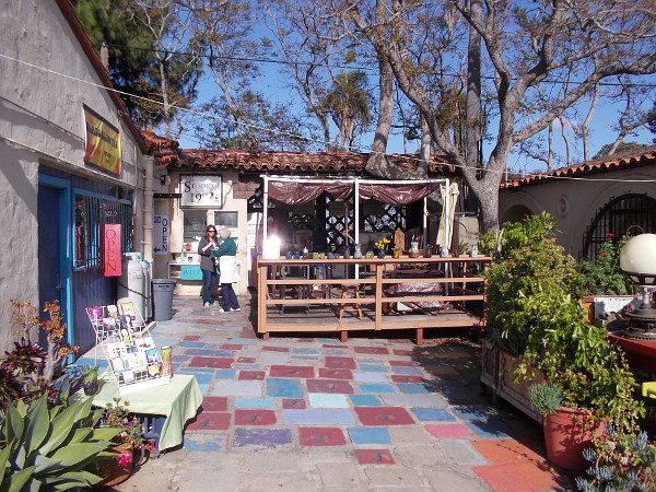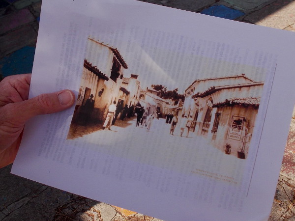 You can see in the above old photograph a no-longer-existing building at the center of today’s large patio. It separated Spanish Village into two “streets” that visitors could enjoy.