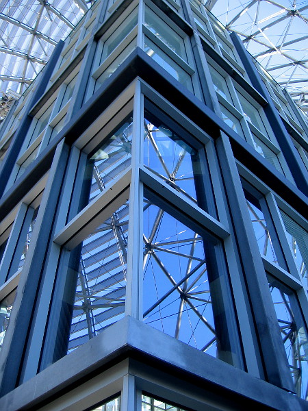 Well, check these out! The curving lines of steel reflected in the building’s windows look like a lesson in complex geometry. You know, in a strange way the dome reminds me of a graph or diagram demonstrating how time and space can be warped by gravity! Am I crazy? What does it look like to you?
