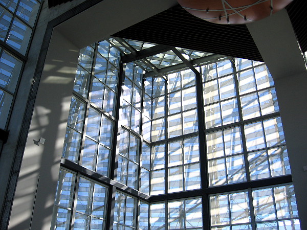 Looking upward at the metal dome and blue sky. Amazing views can be had of downtown from the library’s ninth floor.