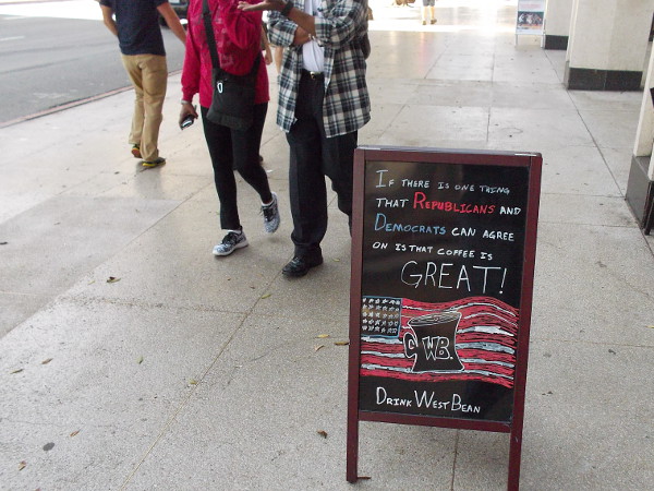 If there is one thing that Republicans and Democrats can agree on is that coffee is Great! Indeed, many things in life are.Perhaps this is wise. Perhaps not. Play today, work mañana.Hazard. One small word to the wise, warning of unseen danger under the deceptively peaceful water of San Diego Bay.More wise philosophy inside a downtown window. Live in the moment, take chances, be here now, tell someone how much they mean to you.Sign on San Diego sidewalk with a powerful, insightful quote. With our thoughts we make the world. Buddha.