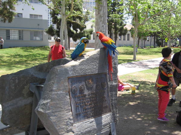 Today was Earth Day on the Bay at the Maritime Museum of San Diego. Exhibitors on the passenger deck of the steam ferry Berkeley demonstrated the work they’re undertaking to protect the environment.It’s Sunday, which is volunteer work day at the Maritime Museum. If I heard correctly, these guys near the San Salvador were applying tar to some steel cables that will be used on the HMS Surprise.Two parrots on the Pearl Harbor memorial plaque near the USS Midway.