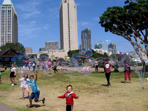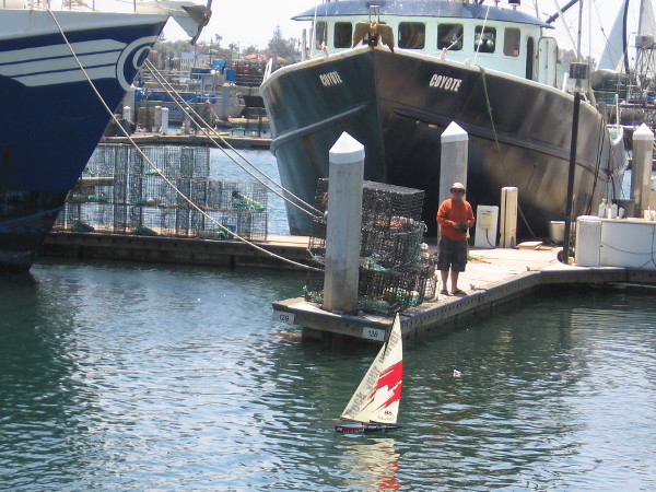Some folks out fishing on the Tuna Harbor pier were catching spotted seabass! This one was too small and was quickly returned to San Diego Bay.This sneaky gull perched atop a docked bait boat seemed to be watching those folks fishing nearby!Someone zooms by riding a bucking water scooter over the sparkling blue water.Close-up photo of a colorful float inside a lobster trap. I just walked along the pier, looking out at boats, water and the beautiful San Diego skyline.Skaters take a break in the sunshine near Tuna Harbor.Someone relaxes on a spring Sunday by maneuvering a remote control model sailboat in Tuna Harbor. Another cool sight along San Diego’s always lively Embarcadero.Fun marine artwork depicts a pod of dolphins in the ocean. A window of the Wyland Galleries in Seaport Village.Colorful banner fluttering in the sea breeze proclaims Life is Good. I always enjoy walking past Alamo Flags in Seaport Village.Just some bright yellow flowers.A street magician, cyclists, and the Californian tall ship out on San Diego Bay.Papa Alex is a very friendly, happy, soulful psychic. He often hangs out between Seaport Village and Embarcadero Marina Park North. His motto is: “Peace and love. No drama.” Sounds wise to me!Wow! Look at those massive bubbles flying through the air! This fun could be found on the grass at Embarcadero Marina Park North.And high above those bubbles was this kite. I love San Diego.Tourists rent some wheels near the Marriott Marquis and Marina.I rested for a bit on the fishing pier at Embarcadero Marina Park South. Here comes the Stars and Stripes racing yacht, carrying passengers enjoying a unique adventure on the Big Bay.And there goes the Silvergate, ferrying people over to Coronado Island. What a glorious spring day!