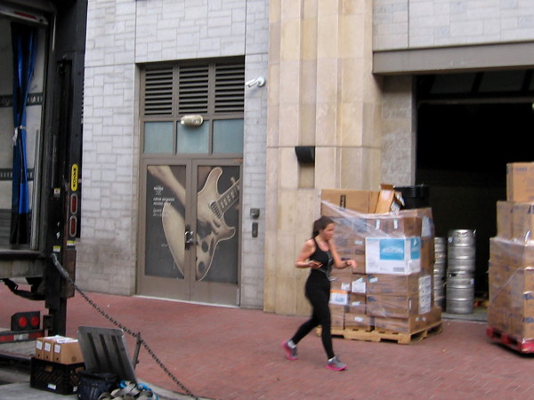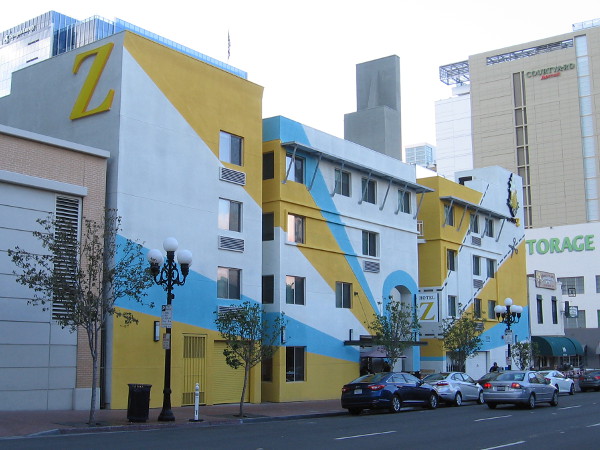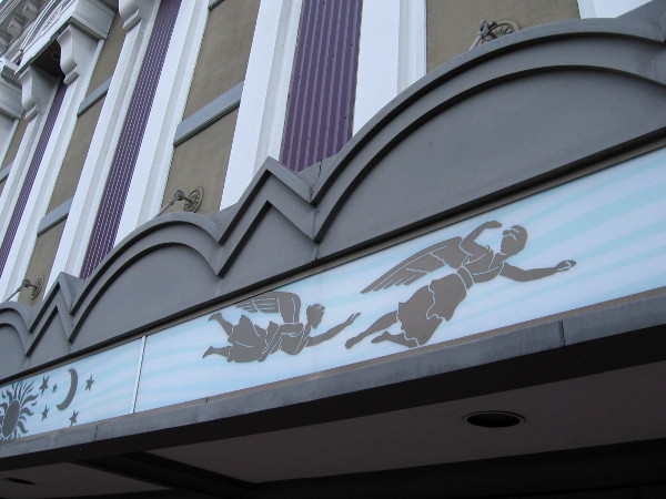 Walking south along Sixth Avenue in downtown San Diego, approaching Ash Street.Reflection in glass panes of the Parking Palace shows the iconic sign atop the El Cortez.Still walking down Sixth Avenue, now approaching A Street.Ornamentation near roof of the old World Trade Center, which has been converted into housing for the homeless. The Art Deco building was once home of publishers Harcourt Brace Jovanovich.A bird flies between skyscrapers.Looking up at a corner of the America’s Finest City mural on Sixth Avenue.A Kurt Cobain quote over doors at the downtown House of Blues. “If it’s illegal to rock and roll, throw my ass in jail.”Banner promotes romance in the Gaslamp Quarter. The nearby Jewelers Exchange in the Timkin Building at the corner of Sixth and E Streets is packed with dozens of small jewelry vendors.Photo of moon, high above towers of Louis Bank of Commerce Building’s facade, one block over on Fifth Avenue. This famous location was home to Wyatt Earp’s Oyster Bar gambling hall and saloon.Rear of Reading Cinemas Gaslamp building. The movie theater closed in February. The complex originally opened in 1997 as Pacific Theatres. It was used in past years for popular film festivals and San Diego Comic-Con screenings.Angels in flight on rear of the now closed Gaslamp movie theater.Old faded words painted on brick exterior of the Independent Order of Odd Fellows Building in San Diego’s Gaslamp spell Tin Shop.Utility box on Sixth Avenue painted with tea, sandwiches, coffee, salads, burrito and bagels. It made me so hungry, I wanted to step through that cafe’s door!Hotel Z really really catches the eye with their new, flamboyant paint job. According to their website, their slogan is A Piece of Pineapple Hospitality.A funny sight glimpsed inside the window of Cute Cakes. San Diego’s Swinging Friar is seated by a big Petco Park frosted cake filled with sprinkle fans!Morning deliveries and jogger near an electric guitar on the employee door of the Hard Rock Hotel.