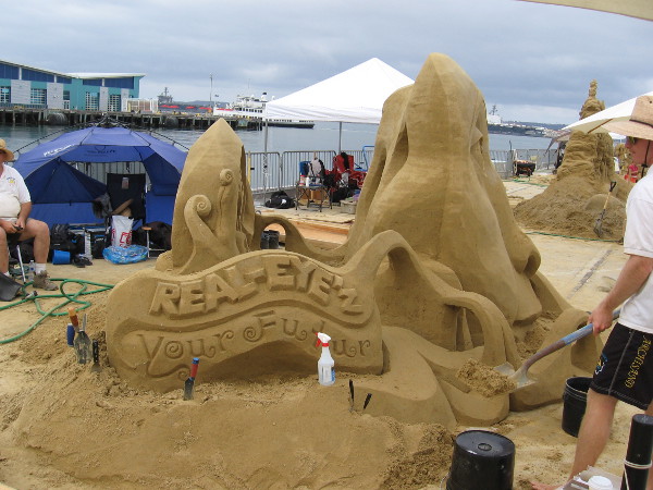 During the 2016 U.S. Sand Sculpting Challenge, San Diego is transformed into “SAND iego”!Inside the 2016 U.S. Sand Sculpting Challenge on the B Street Pier, food trucks, vendors with art, and some sponsored sand sculptures attract the eye of visitors.This way to the Cool California Carvers, who on Saturday morning are still working on their sand sculptures. We’ll check out the World Masters Solo Competition in my next blog post!Looking down the length of the B Street Pier between the Broadway Pier Port Pavilion and the San Diego Cruise Ship Terminal. These artists you see belong to teams representing the Cool California Carvers.Magnify It! That’s the name of this complex three-part sand sculpture, being built by the Sand Squirrels and SD Sand Castles.Peer through the telescope-like eyepiece and you see a peace sign superimposed on planet Earth!These creative people are the I.B. Posse. Their sand sculpture is titled United We Stand. I see they are working from a small model.Talented sand sculptors work on the flaming torch from New York’s Statue of Liberty.Carving the base of Lady Liberty’s torch.Reaching upward together with peaceful aspirations.Team Archisand is creating an unusual sand sculpture called REAL-EYE’z Your Futur.Small people stand together behind a mask-like face made of sand.Many of these fantastic works of sand art really catch the eye! We’ve got some great local teams!This sand sculpture seems to recreate a coral reef. I don’t know its title. I do know Team San Diego San Castles created it!A close-up photo of some marine life living in a coral reef made of carved sand–on a pier!A team called The Sandcastle Man is bringing some Crazy Dreams into reality. Yes, that’s the name of this sand sculpture.We’re All Mad Here! It must be an Alice in Wonderland themed sand sculpture! I see a team member of Archisand.I see Alice, the White Rabbit and the Mad Hatter!Visitors to the 2016 U.S. Sand Sculpting Challenge check out artwork being created by one of the Cool California Carvers teams.And that team is called The Sand Squirrels. The title of this cool art is The Captain’s Tale.That sea-going captain appears to be a pirate who has discovered a treasure chest. Or perhaps it’s a mirage made of beach sand on some deserted island…or on a city pier!