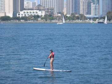 A standup paddleboarder off Coronado, with sailboats and the San Diego skyline in the background.