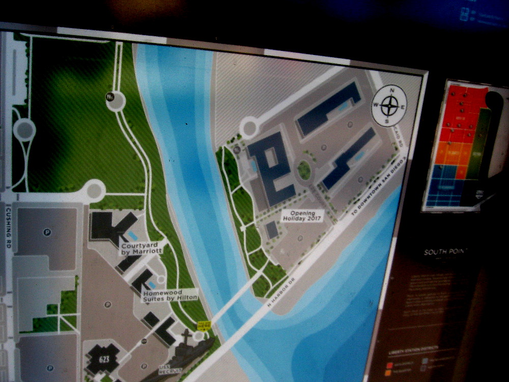 I love parks. So a discovery I made yesterday made me very happy. A completely new esplanade is being created at Liberty Station! The narrow park will run along the east shore of the boat channel, allowing visitors to walk, recreate or just relax on either side of the water. The shady trees and green grass appear ready to go! Three new hotels are also being built near the esplanade, at the site of the old Wally Park airport parking lot.