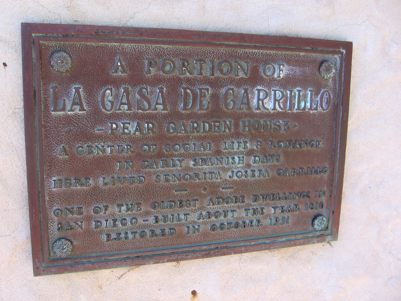 Bronze plaque near the front door reads:  A portion of La Casa De Carrillo – Pear Garden House. A center of social life and romance in early Spanish days. Here lived Senorita Josefa Carrillo. One of the oldest adobe dwellings in San Diego. Built about the year 1810. Restored in October 1931.
