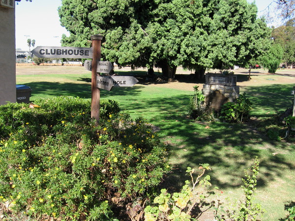 Sign near historical marker for Casa de Carrillo points to the golf course clubhouse and first hole.