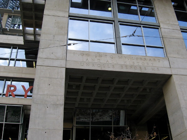Many wise words are digested by hungry minds at the San Diego Public Library. At the Central Library in downtown San Diego, wise sayings and phrases are inscribed upon the building itself. One must simply open eyes to find inspiration.