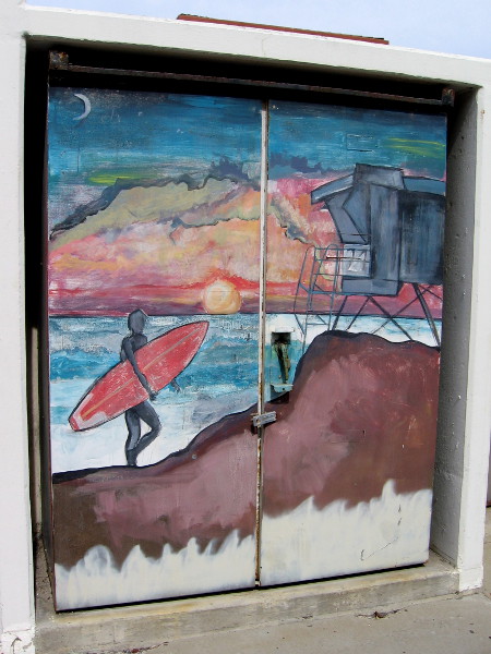 Street art on doors shows a surfer climbing toward a lifeguard tower at sunset.