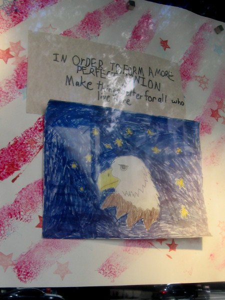 Please enjoy a few photos that I took yesterday as I walked down Broadway past the Edward J. Schwartz United States Courthouse. My eye was attracted by happy, colorful artwork created by children on display in some windows.