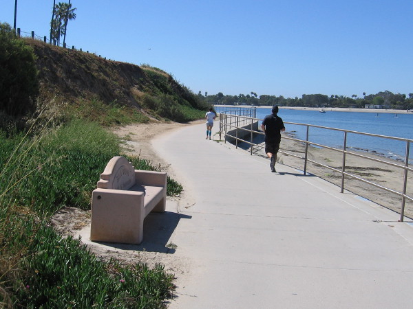 Benches can be found at intervals along the pedestrian and bike path that circles much of the bay. Most of these benches feature a small plaque dedicated to a beloved person or memory.