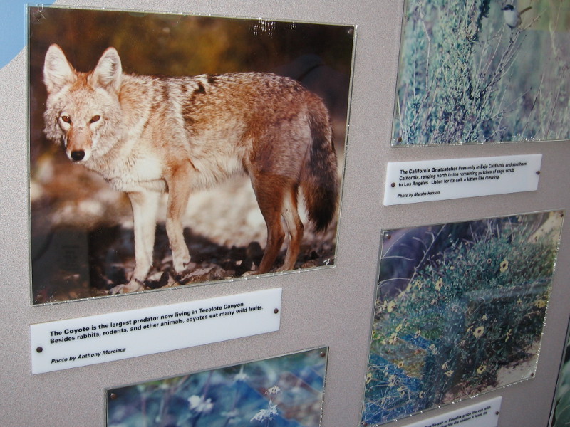 A sign near entrance to the Nature Center provides information about Tecolote Canyon Natural Park.A narrow strip of natural habitat preserved in San Diego. Tecolote Canyon features hiking trails and a refuge for wildlife.Sign inside the Tecolote Nature Center. The park was originally dedicated in 1977. Houses, yards and streets surround this area where the native environment still survives.Many interpretive displays can be found in the Nature Center. The coyote is Tecolote Canyon’s largest predator.One sign describes San Diego’s Coastal Sage Scrub habitat, which is found in a small part of the world, along the coast of Southern California into Mexico.The Brown Towhee is one of many birds one might spot in the canyon.Along Tecolote Creek lies the Riparian Woodland habitat. Water attracts animals from the dry hills, and native trees like willows, cottonwoods and sycamores grow near the creek’s banks.One of the displays shows Lemonadeberry (a common chaparral shrub in San Diego), Fuchsia Flowered Gooseberry, and a California Thrasher.A topographical representation of curving Tecolote Canyon, which you can see directly below Mission Bay. Up is west, right is north.Many of the plants and animals now in Tecolote Canyon are the same as those here 200 years ago. Golden eagles and mountain lions, however, have vanished because this natural space is too limited in size.Families enjoy a special day and learn about the canyon’s environment. It’s Tecolote Family Day! There were lots of educational displays and activities at the Nature Center.Activities at Tecolote Family Day included a scavenger hunt for kids, art, music, dance and a silent auction.Inside the Nature Center, one table had lots of displays concerning insects! Another one had snakes.At another table I was shown a coyote skull.I believe these beautiful poppy paintings were part of the silent auction.A friendly parrot was at a booth promoting Zovargo, a local business that offers animal summer camps for kids.These kids were dancing to a fun song about pollination!Nearby I discovered the Tecolote Native Plant Nursery.Work is ongoing to take back the native habitat from invading plant species.I saw some signs about the importance of composting. It enhances soil and protects watersheds.Behind the Nature Center, near an amphitheater and native garden, I saw this example of an e’waa, a simple willow branch structure built by the Native American Kumeyaay.A sign depicts the Tecolote Watershed. Pollutants can flow down the creek and enter the soil, Mission Bay and eventually the Pacific Ocean.Several signs can be found around the small native garden. This one, Aromas of the Canyon, depicts Black Sage, White Sage and California Sagebrush.On the way to the hiking trail that leads into Tecolote Canyon, one might spot this owl!Hikers read the sign at the Battle Trail trailhead.Welcome to the Battle Trail – Nature’s haven in the city.I start up the easy trail. The vegetation in Tecolote Canyon is still green in late spring, after a very rainy winter.This lush greenery will soon dry out in the Southern California summer and turn mostly brown.I am greeted by cheerful yellow flowers.I believe this house on a post is for bats. I’ve seen similar boxes in other open space parks around San Diego.A family heads into Tecolote Canyon to explore nature.