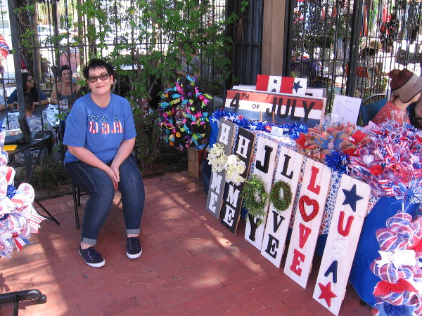 A nice lady with some Fourth of July crafts smiles for my blog about San Diego.