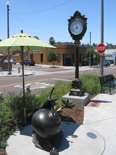 Legacy Park also includes a memorial clock and a bronze sculpture of the Helix snail. The 1939 U.S. Post Office Building is seen in the background.