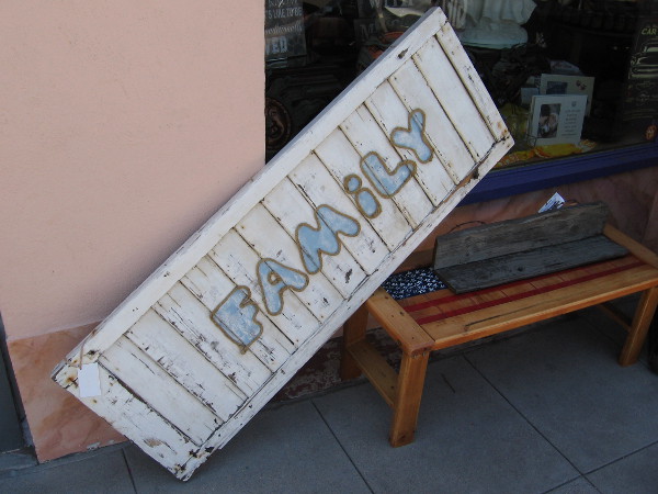 Family and a flag bench in front of Amethyst Moon, a unique gift store in The Village of La Mesa.