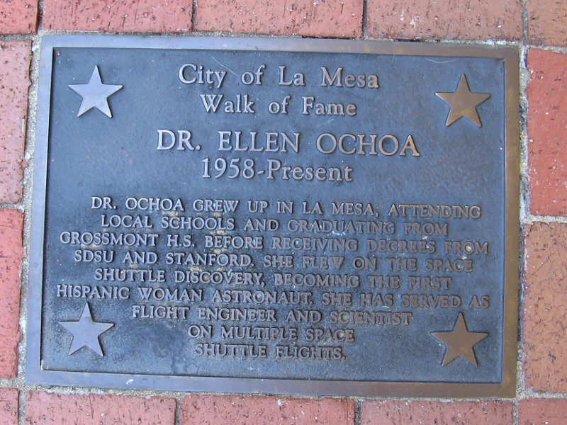 Another plaque celebrates Dr. Ellen Ochoa, graduate of La Mesa’s Grossmont High School and the first Hispanic woman astronaut.