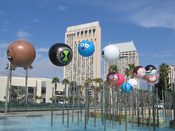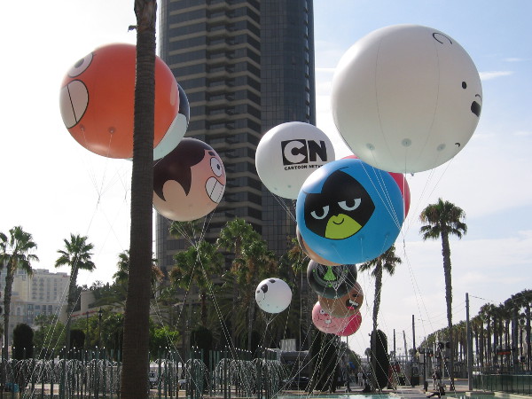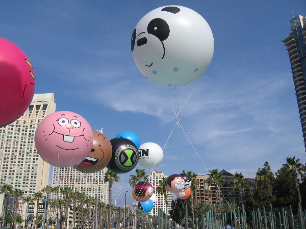 Fourteen of seventeen Cartoon Network character balloons have been inflated so far for 2017 Comic-Con. You can see them soaring above the fountain at Children’s Park on MLK Promenade! I learned this morning two more balloons will be added tomorrow, and one final balloon on Friday!