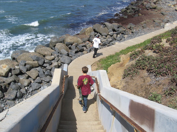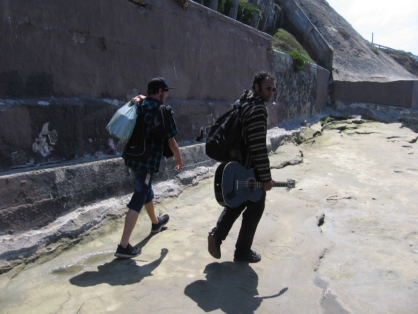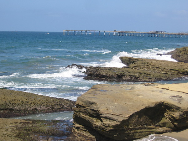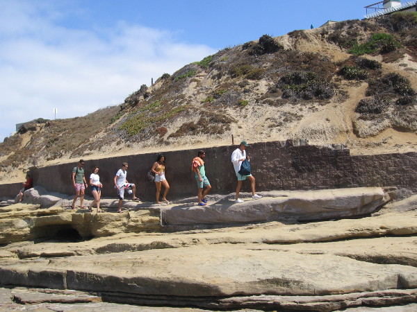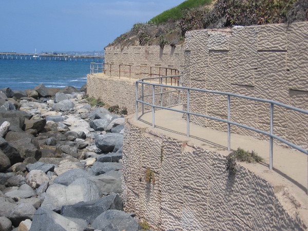People explore tide pools between the sand-filled, long-defunct Plunge and the OB Pier.The saltwater Plunge, now often called the Sandbox, was built in 1917. Famous English Channel swimmer Florence Chadwick, who grew up in San Diego, trained in this historic pool.We’ve passed the Plunge, which is officially part of the beach, and are now carefully traversing sandstone rocks along the base of cliffs. It can be very slippery.Looking back north we see the Ocean Beach Municipal Pier and beach.People enjoy looking into small tide pools in the eroded sandstone. I occasionally saw some small crabs.The easily carved sandstone is like a book containing years of names and often humorous images.OB is a place for free spirits, and the rocks along the water attract many.Looking north again. I see Pacific Beach and La Jolla in the distance.Splashing water and curious eyes.People peer down at us from the street level above.A small group walks along the crude trail.A perfect day to explore nature’s many wonders beside the ocean.Someone heads toward one of the small pocket beaches tucked between rocky outcrops.Standing on a tiny beach at the water’s edge.The sandstone cliffs are unstable and sometimes you hear of people accidentally falling and needing rescue.Here comes a guy and his dog.As we continue to walk south, we can see the coast vanishing into the distance. The actual Sunset Cliffs neighborhood is farther down the Point Loma peninsula.A white sailboat out on the wide blue Pacific Ocean.In places the rocky and slippery sand footing is a bit difficult to navigate, even on the trail. Wear good shoes!Looking north. Spectacular scenery.More natural beauty.The rough trail continues south. Fewer people seem to be in this section.Now we’re approaching an interesting part of the walk, with a short, undulating path along a sea wall.Looking back.We’ve almost reached the end of our walk. The concrete pathway ahead has either been undermined by water, or intentionally made into a ramp for thrill seekers.At the foot of old stairs that climb up to Orchard Avenue.As we head up, someone begins down.Two people begin their own adventure along the rocks.Looking back north at the short stretch we just finished.Someone gets exercise on the steps. At the top there is some fun artwork.Relaxing on a unique surfboard bench, gazing across the magical blue ocean.
