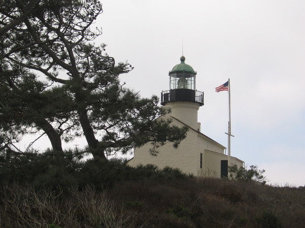 The historic Old Point Loma Lighthouse is a major attraction at Cabrillo National Monument in San Diego.Visitor to Cabrillo National Monument looks up at the lighthouse.Built in 1855 at the end of the Point Loma peninsula, above the entrance to San Diego Bay, the old lighthouse used to guide sailors to safety with a powerful fresnel lens.Walking around the old lighthouse is a wonderful experience, with amazing views in all directions.The cluster of trees near the Old Point Loma Lighthouse are rare Torrey pines, which are native to this region.Walking along the cliffside trail north of the lighthouse.Someone sits high above the blue Pacific Ocean enjoying the cool breeze and natural beauty.South of the lighthouse, people walk toward the gray whale migration overlook.Visitors to Cabrillo National Monument scan the watery horizon for ships and whales.A park ranger and volunteers were removing non-native plants among dry stalks of California sunflower and buckwheat. Invasive species can crowd out native species.People approach the handsome lighthouse from the south.Photo of Old Point Loma Lighthouse, the small museum beside it and the large Rain Catchment Basin.Visitors to San Diego are strongly encouraged to enjoy some time at Cabrillo National Monument. It’s a very special place, with many paths to walk.