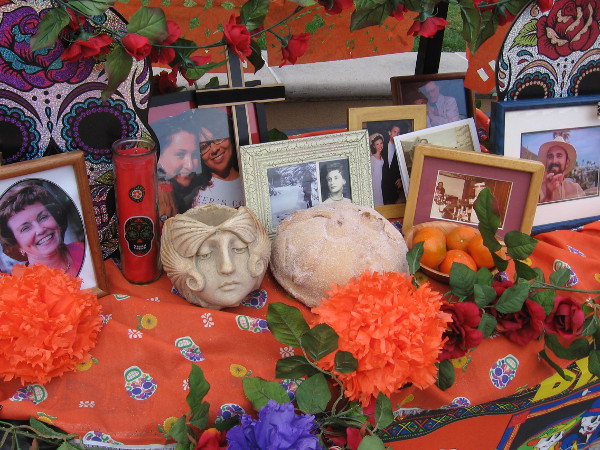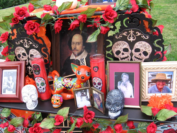 Day of the Dead altar created by the Old Globe Theatre contains photos of departed loved ones, roses, candles, and an image of Shakespeare.