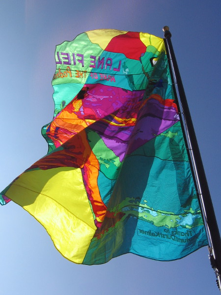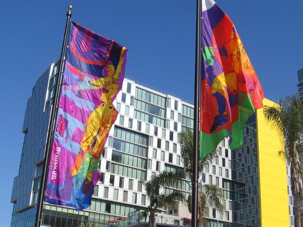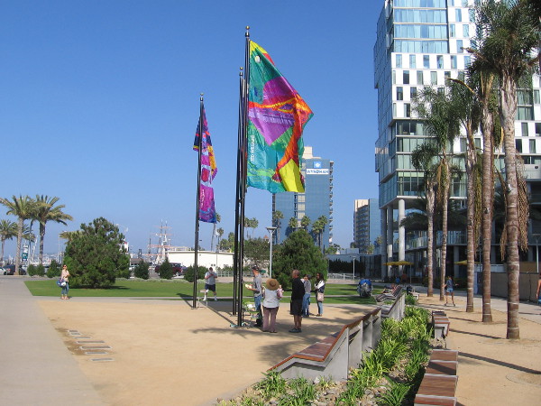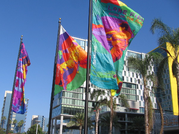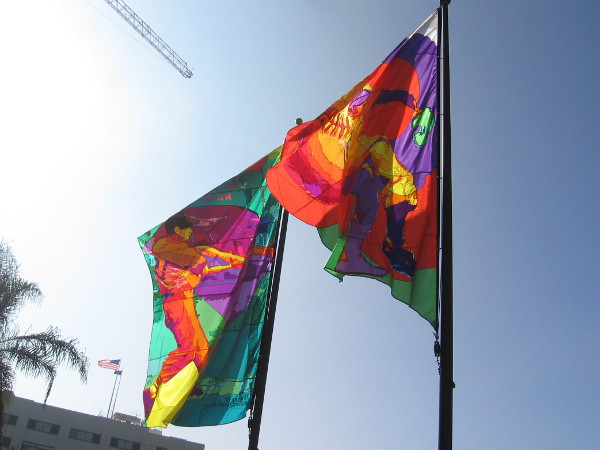 Three huge, colorful flags will soon be flying above Lane Field Park. They were created by local artist Lisa Schirmer in a coordinated effort between the Port of San Diego and the Hensel-Phelps Construction Company. They celebrate the history of baseball at Lane Field.