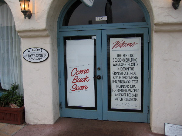 Yesterday morning I took some photos of the 1929 Sessions Building in Old Town San Diego State Historic Park. The handsome stucco building was designed by renowned San Diego architect Richard Requa, who was the Master Architect for the 1935 California Pacific International Exposition held in Balboa Park.