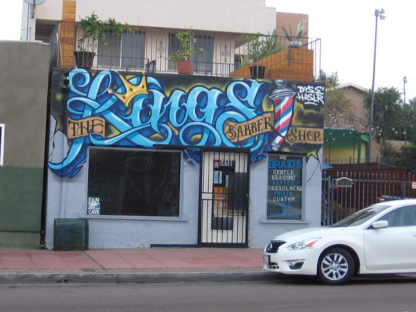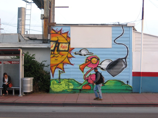 Another side of the same box. Weird humanoid figures seem composed of fluid ink.Urban artwork that seems both ancient and futuristic. Strange geometric patterns in these figures appear symbolic.The fourth side of the box.Cool mural in City Heights on the side of the Teros Gallery. Journey Within Through the Sea of Soul, by Celeste Byers and Aaron Glasson, depicts the gallery owner riding a Chihuahua ship on a distant planet upstream into herself!Walking east down University Avenue I spied more street art on electrical boxes.A young girl, and a young boy with binoculars.A man and small child together ride a motorcycle.A face looks upward.Another young face, and a sitting girl reaching for what appears to be a pencil.This trash can at a bus stop was brightly decorated by a street artist.More fun street art, near the corner of University Avenue and 35th Street.A funny dog appears to be assailed by a crazy bird.More humorous faces and birds.I’ve crossed the street and am heading back west. I noticed this colorful tower to the south features references to both City Heights and Cherokee Point, a neighborhood south of University Avenue.Before crossing the street I spied this fun street mural near another bus stop.Now that I’m walking next to it, I can really enjoy this sun and pink flamingo. Both are wearing sunglasses. By artist Gilly Bee, created for #TheAvenueMuralProject.I found another super cool mural on the side of The Kings Barbershop.The front of The Kings Barbershop was painted by DyseOne and Hasler.A very colorful mural on University Avenue in City Heights! I believe this bold spray paint art is fairly new.It’s the Tooth Fairy on the wall of North Park Dental! By artist Sand One, a Latina street artist from East Los Angeles.