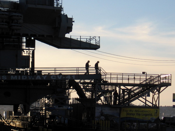 The U.S.S. San Diego Memorial attracts walkers. Another day is nearing an end on San Diego’s Embarcadero.