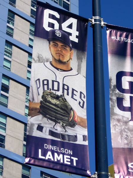 During a walk around Petco Park last weekend, I spied 2018 Padres players on lamppost banners. And, naturally, I took photos!