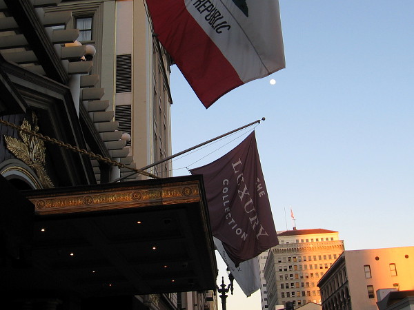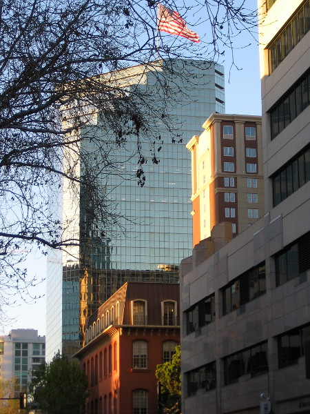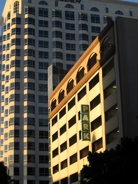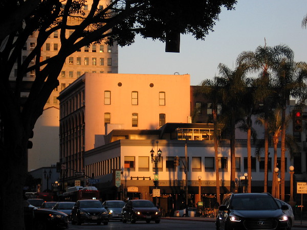 As I headed west along Broadway, slanting sunlight touched downtown buildings in unexpected ways, as if cast by a wizard with a flashing wand. The sun rolled away and the moon brightened. And then a few city lights blinked on.